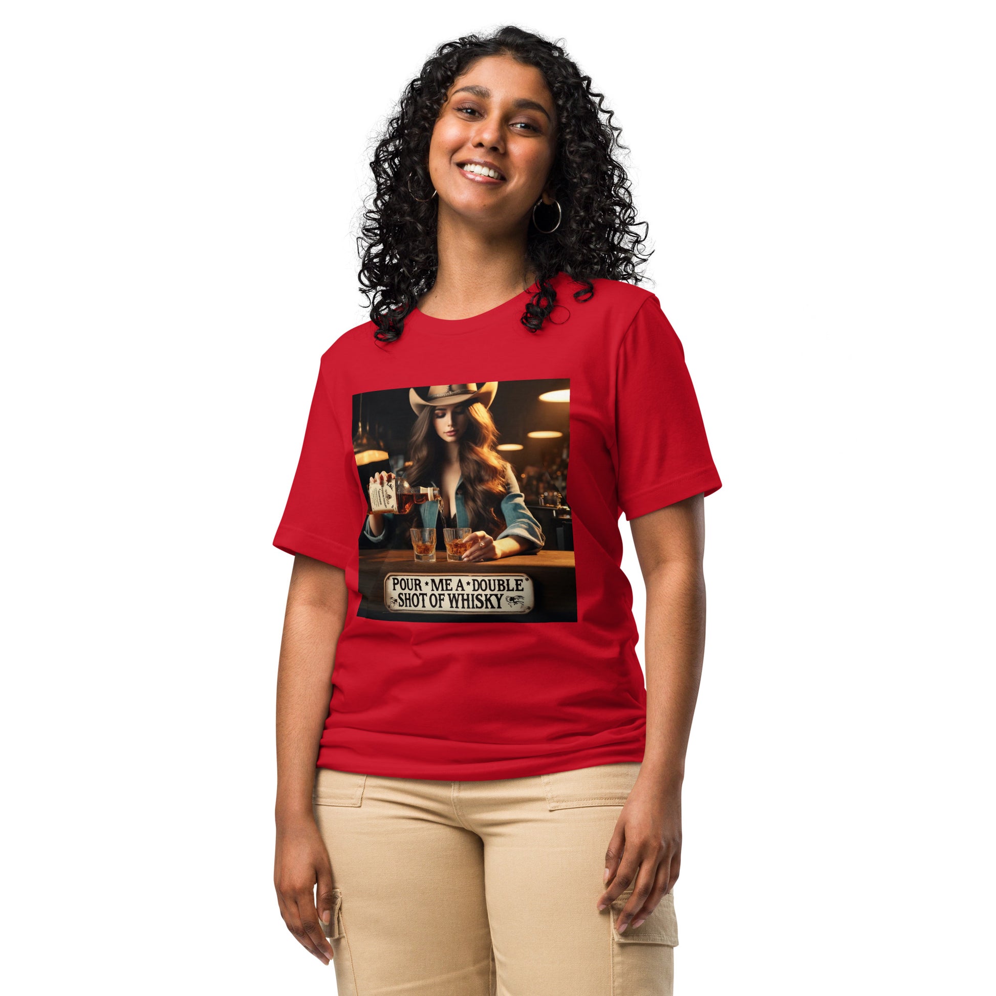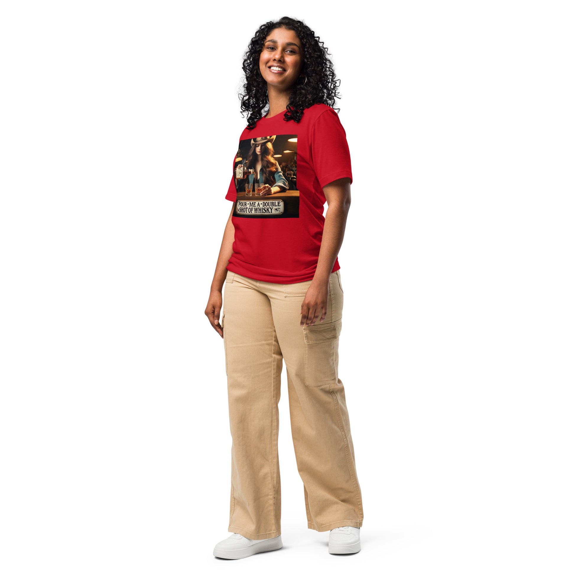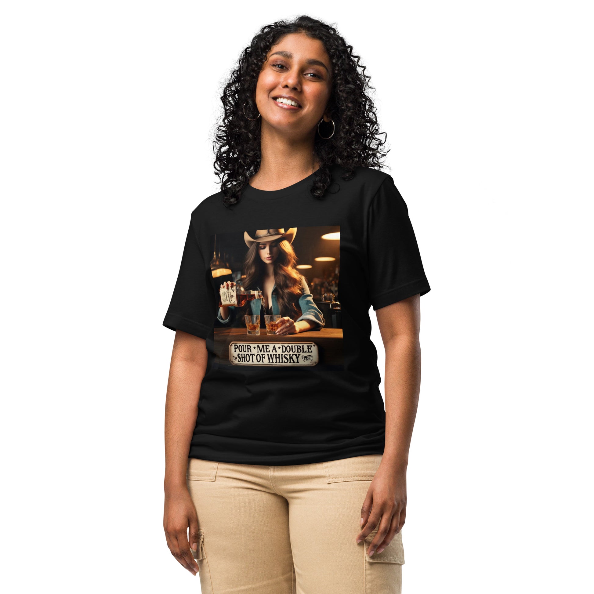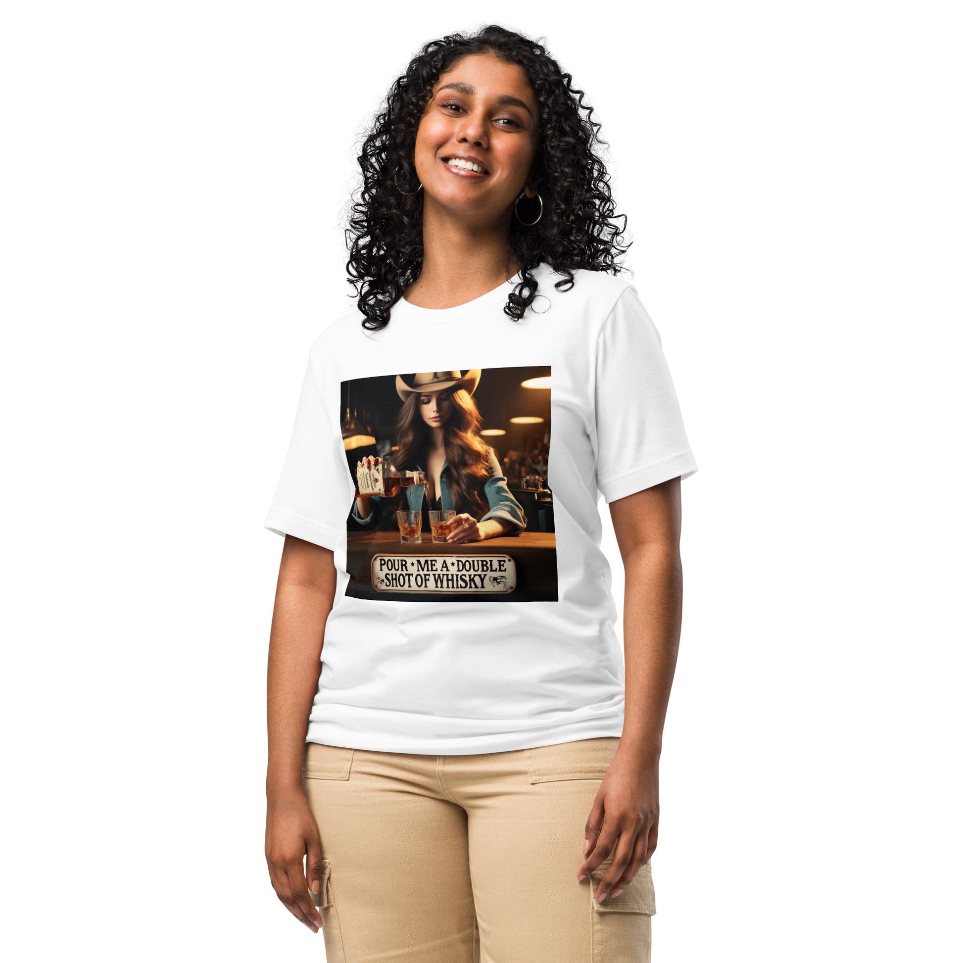Elevate your style with our Double Shot Whiskey Charm Tee. This chic shirt features a captivating graphic of a whiskey pour and a confident, elegant figure, blending rustic allure with modern sophistication. Crafted from premium, soft cotton, it ensures all-day comfort and a flattering fit. Perfect for casual gatherings, whiskey-tasting events, or making a stylish statement, this tee pairs beautifully with jeans or a skirt. Celebrate your love for whiskey and timeless fashion with this must-have tee.